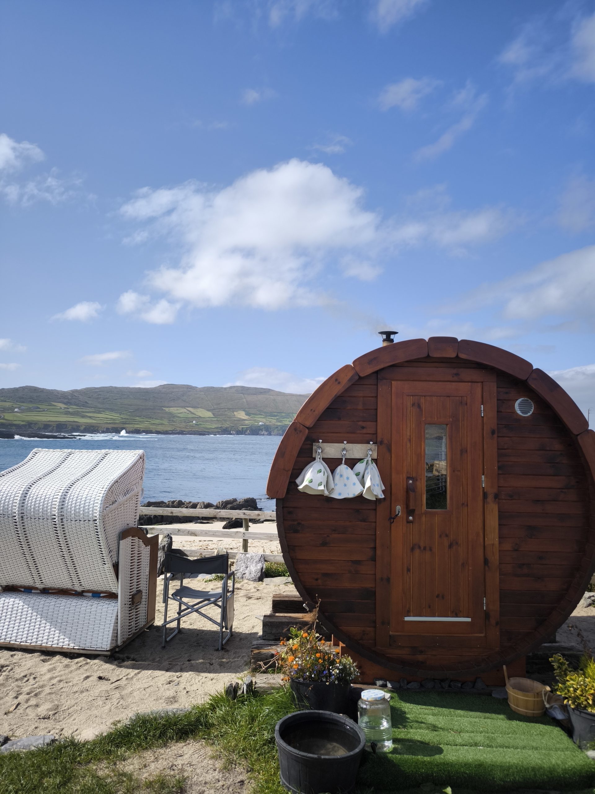 Allihies sits at the wild western tip of the Beara Peninsula, where the Atlantic hits hard and the air is as fresh as it gets in Ireland. After a dip in the crystal-clear waters of Ballydonegan Bay, there’s nothing quite like stepping into our wood-fired sauna to warm through — salt on your skin, heat in your bones, and those sweeping views of the Slieve Miskish mountains stretching out in front of you. It’s one of the most restorative ways to experience this remote, beautiful corner of Cork.
